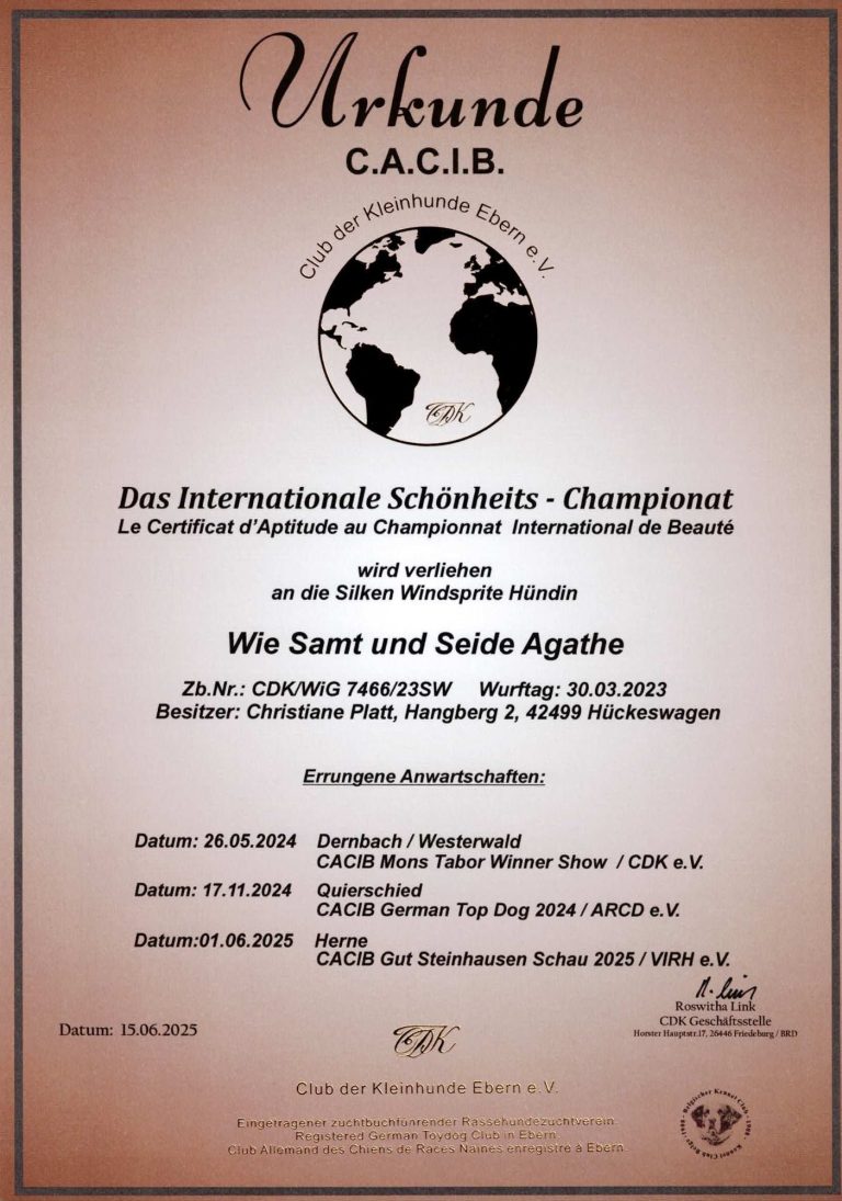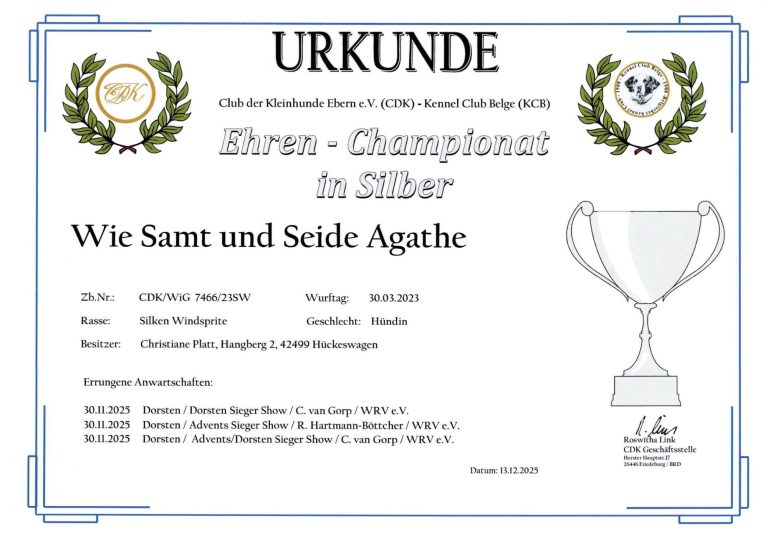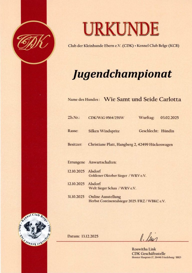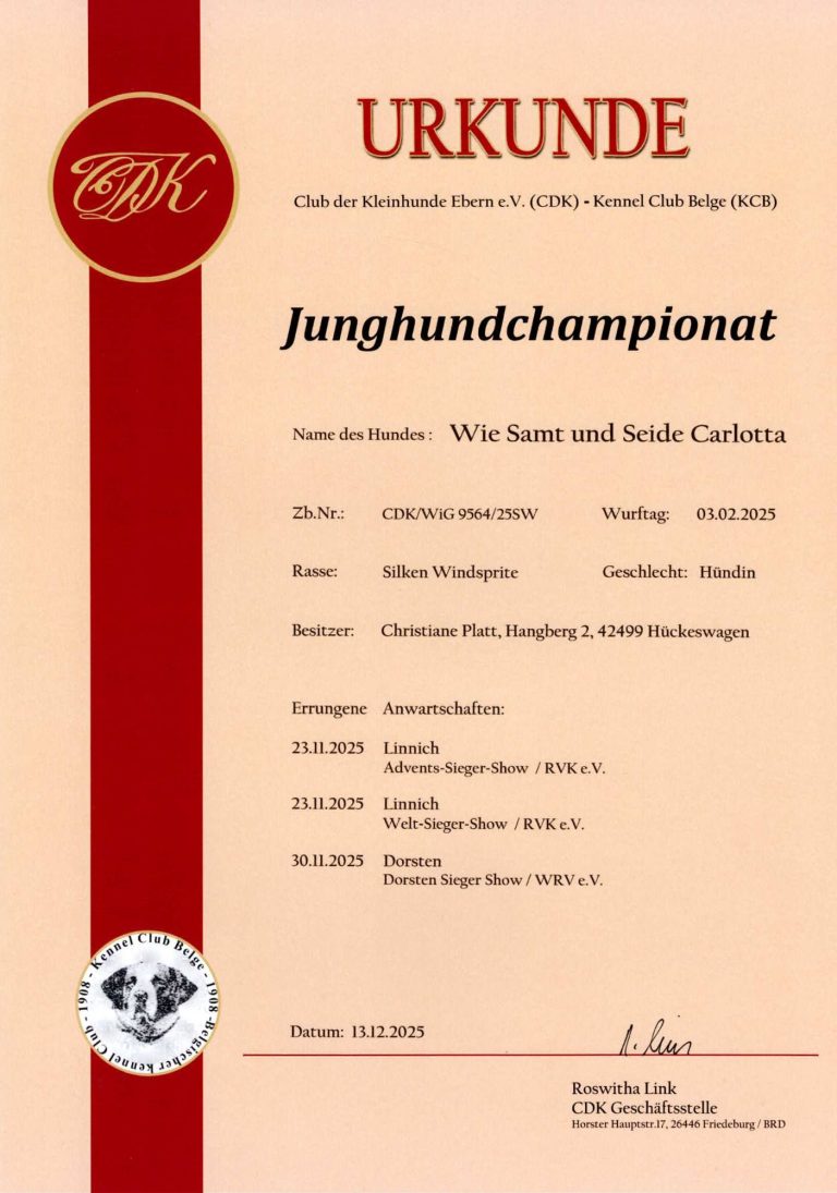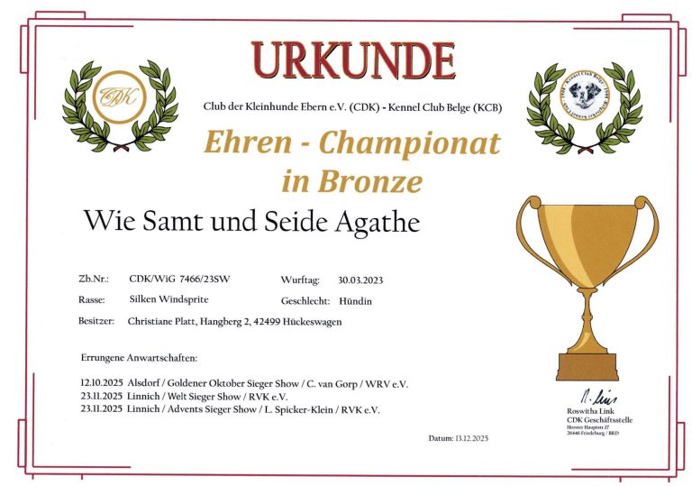 - Junghundchampion, nationales Schönheits Championat, internationales Schönheits Championat, Ehrenchampionat Bronze und Ehrenchampionat Silber.