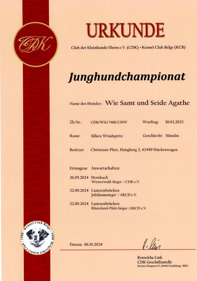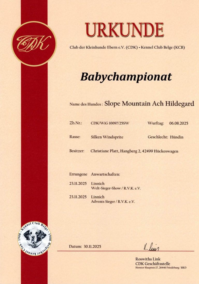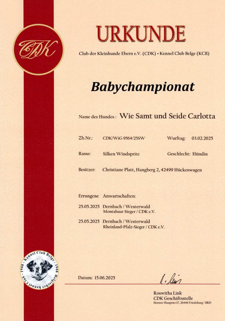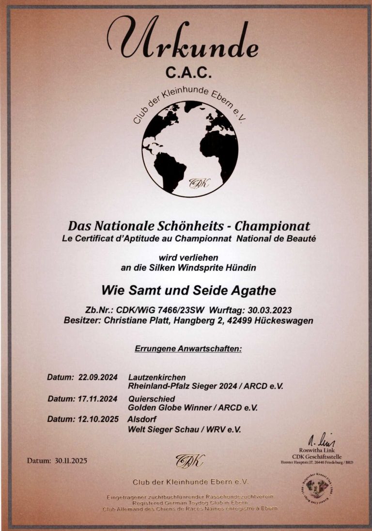 - Junghundchampion, nationales Schönheits Championat, internationales Schönheits Championat, Ehrenchampionat Bronze und Ehrenchampionat Silber.